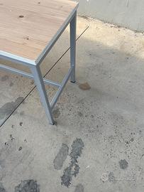 Tavolino da esposizione con struttura in metallo e piano effetto legno chiaro, ideale per negozi, showroom o laboratori. In ottime condizioni