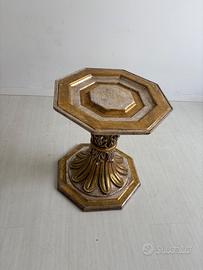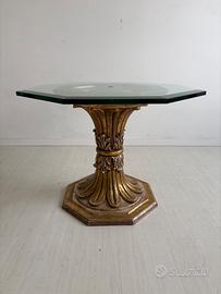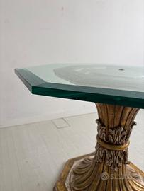 Tavolino da fumo con base in legno intagliato e piano in cristallo. Il cristallo presenta qualche graffio superficiale.