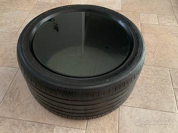 Tavolino da fumo moderno lucido in vetro fume’ e gomma pirelli F1 in ottime condizioni Diametro 70 cm e altezza 33 cm X info contattare 3930254023
