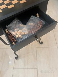Tavolino piedistallo, con raffigurata scacchiera, compreso di cassettino e pedine da scacchi