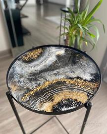 Questo tavolino è un esempio affascinante di interior design artistico, dove la funzionalità incontra l'arte astratta. È un pezzo unico che richiama l'estetica dei geodi o dei paesaggi naturali visti dall'alto.