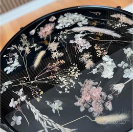 Il contrasto tra il nero assoluto della base e la fragilità dei fiori chiari conferisce al tavolo un aspetto elegante.