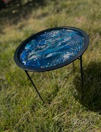 Questo tavolino è un pezzo d'arredamento dal design moderno e suggestivo, dove la resina epossidica è protagonista assoluta, trasformando il piano d'appoggio in una vera e propria opera d'arte astratta.