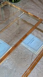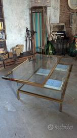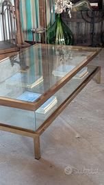 Tavolino da salotto anni 70, in vetro e ottone, con ripiano scorrevole. In ottime condizioni Misure: L149 x P79 x H41cm