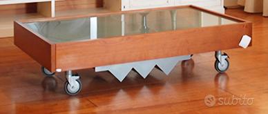 È caratterizzato da una struttura in legno e un piano in cristallo satinato, ed è apribile con un vano portabottiglie all'interno.