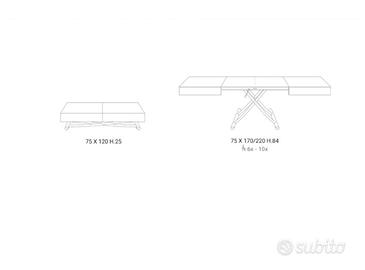 Tavolino trasformabile che si trasforma in tavolo da pranzo. Struttura in metallo e meccanismo con pistone a gas. Regolabile in altezza al millimetro. Ruote a scomparsa( da precisare che i pistoni sono da comprare)