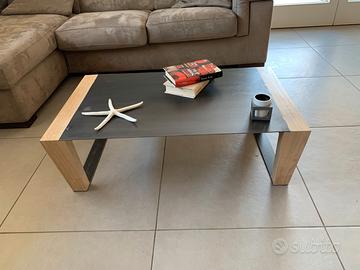 Tavolino di design, cuore di castagno massello e piano in lamiera nera