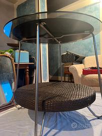 Tavolino da salotto di design con piano in vetro circolare e ripiano inferiore in rattan intrecciato.