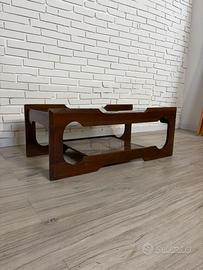 Tavolino da salotto italiano di modernariato maturo degli anni ’70, caratterizzato da linee scultoree e da una struttura architettonica in noce, con piano in vetro fumé e ripiano inferiore nello stesso legno.