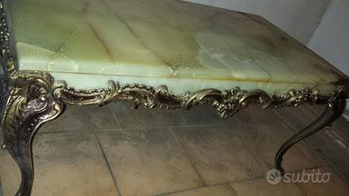 La lastra in alabastro verde dallo spessore di circa 2,5 cm misura 50 x 105 cm e poggia su un telaio di ferro con gambe in ottone pieno altezza circa 40 cm per un peso di oltre 50 kg.