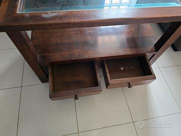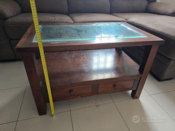Vendo tavolino da salotto in legno scuro con piano superiore in vetro, ripiano centrale e 2 cassetti frontali. Pratico e capiente, ideale per soggiorno o sala TV. Misure indicative: 80 x 60 x 50 cm. Usato, in buone condizioni generali, con normali segni del tempo e dell’uso visibili in foto. Torre del Lago
