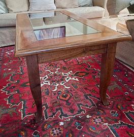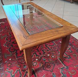 Tavolino da salotto in legno e vetro, come nuovo. Misure: Lunghezza 110 cm. Larghezza 55 cm. Altezza 47 cm.