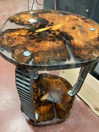 Tavolino unico, di pioppo, affogato in resina epossidica trasparente e trattato con vernice trasparente da carrozzeria con particolari in fusione di alluminio sabbiati e trattati con vernice trasparente da’ carrozzeria e piedi in alluminio torniti lucidati e verniciati con trasparente da carrozzeria. Tutto fatto artigianalmente