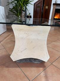 Vendo tavolino da salotto con piano in vetro spesso trasparente e base decorativa in resina, stile classico con dettagli a foglia.