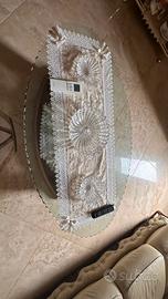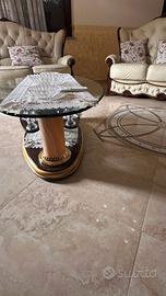 Tavolino da salotto dallo stile classico, caratterizzato da un piano ovale in vetro spesso con bordo lavorato.