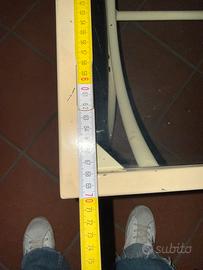 Vendo elegante tavolino da salotto con piano in vetro e struttura in metallo verniciato color crema. Il design è semplice ma raffinato, con base curva che lo rende stabile e decorativo, perfetto per soggiorno, sala d’attesa o studio.