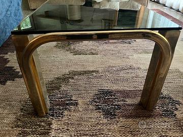 Bellissimo tavolino in metallo color dorato (a seconda della luce) e superfice in vetro, il cui colore e' un verde/grigio fume'.
