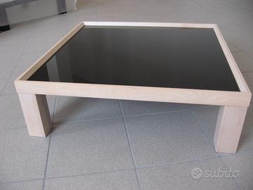 Produttore, causa cessata attività, vende a costo di realizzo, con imballo originale, tavolino modello RIBOq, NUOVO, con struttura in frassino massiccio tinto rovere sbiancato, e piano d'appoggio in vetro laccato nero ribassato all'interno del telaio.