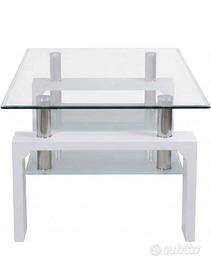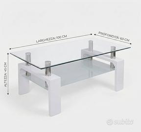 Tavolino da Salotto in Vetro Temperato Trasparente con Gambe in Legno Laccato Bianco, Design Moderno con Ripiano Inferiore, Piedini in Metallo Cromato 100x60x45 cm Vendo per trasloco