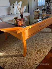Tavolino da salotto in legno di ciliegio, con piano in vetro bisellato su quattro lati e cassetto contenitore. Misure: lung. cm.120, largh. cm.69, h. cm.40.