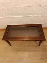 Tavolino da salotto con bacheca in legno e piano in vetro, classico ed elegante.