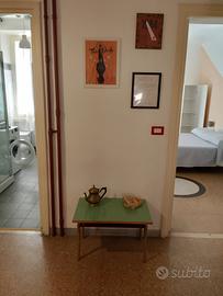 Banco da scuola anni 80 in bachelite modificato per essere usato come tavolino da salotto o da ingresso. Misure L 70 P 46 H 44 cm.