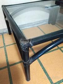 Ampio e robusto tavolo quadrato da salotto, con struttura in bamboo in verde petrolio e ripiano in vetro. Buono stato. Piccolo punto di usura su un angolo, come da foto.