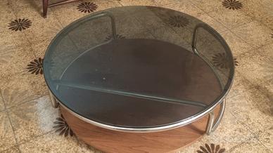 Questo tavolino rotondo da salotto presenta un piano superiore in vetro fumé e una base inferiore in legno.