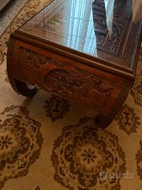 Splendido tavolino da salotto in legno massello finemente intagliato a mano, con piano superiore in vetro trasparente.