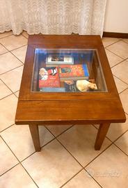 Tavolino in legno massello in arte povera con contenitore per oggettistica protetto da vetro. Apertura scorrevole come da foto. Misure 46H 60P 90L. Il tavolino presenta lievi segni d'uso. Solo consegna a mano.
