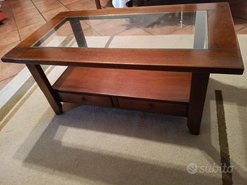 Vendo tavolino da salotto in legno con piano in vetro e 2 comodi cassetti. Solido, capiente e in buone condizioni. Ideale per soggiorno.