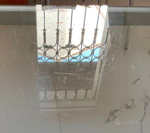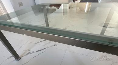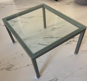 Tavolino da salotto con struttura in metallo e piano in vetro temperato super resistente (sostiene una persona in piedi. Dimensioni 70 x 85 alto 43 cm. Qualche graffio sulla struttura (da riverniciate) e sul vetro.