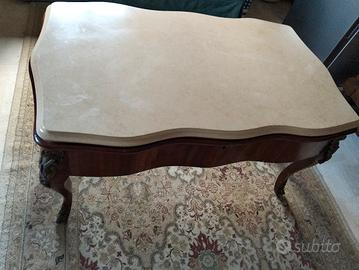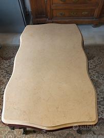 Tavolino da salotto vintage con marmo lavorato nelle bordature colore avorio con qualche segno lieve di usura nulla quasi a dire, ai lati della gamba bronzo con faccia donna. Il tavolino togliendo il marmo si può aprire e mettere dentro qualsiasi cosa.