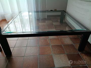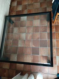 Vendo da caffè in vetro con profilo in legno e gambe in metallo laccate nere 115,5 x 115,5 cm - altezza 35 cm. Buone condizioni di manutenzione