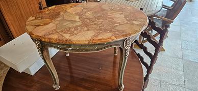 Tavolino da salotto vintage con piano in marmo marrone variegato e base in legno scolpito. In stile classico/barocco, con gambe curve e decorazioni intagliate. Piano in marmo naturale e struttura in legno laccato.