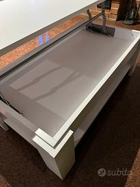 Tavolino da soggiorno con piano sollevabile, comprato da Conforama. Misure in foto. Buonissime condizioni, piccolo segni di usura causa trasporto. NO SPEDIZIONE Ritiro a casa / incontro in luogo pubblico a max 20km da Villareggia (TO)