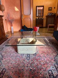 tavolino da soggiorno con base di marmo e piano di vetro.