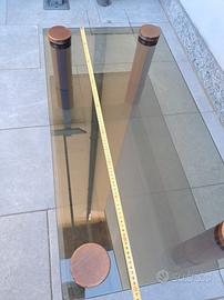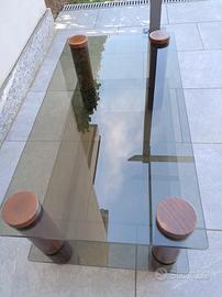 Tavolino basso da salotto con: doppio ripiano in vetro fumé. Struttura con colonne in legno. Vintage. Stile tipico anni ‘80–‘90. Solo ritiro a mano
