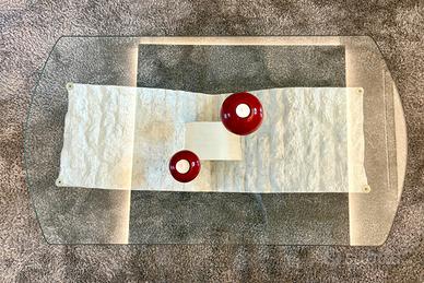 Tavolino da soggiorno in vetro trasparente con angoli arrotondati, base in plastica effetto pietra bianca, molto realistica. Misure: lunghezza 116 cm, larghezza 64 cm, altezza 40 cm, spessore vetro 1 cm. Ottimo stato, tenuto molto bene.