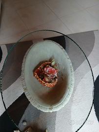 Vendo tavolino da soggiorno composto da vetro temperato spessore 1cm con trattamento antitaglio, dalia in cemento con trattamento invecchiato e bouquet di fiori secchi all'interno.
