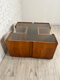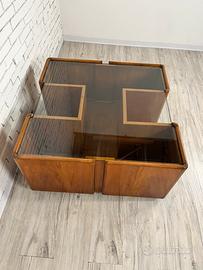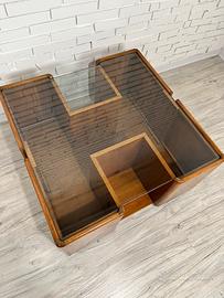 Elegante tavolino di design italiano anni '50, struttura geometrica in noce nazionale biondo, piano in vetro sagomato con forma a croce aperta.