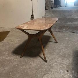 Tavolino italiano da caffe' di metà secolo stile Ico Parisi (anni '50). Il piano in marmo rosa rettangolare, poggia su una base composta dalle iconiche gambe a forma di boomerang in legno e dai piedini in ottone di Parisi. Visibile ad Ivrea To su appuntamento. Gentilmente solo interessati