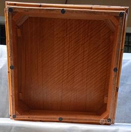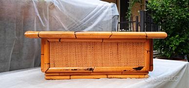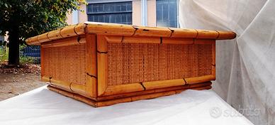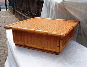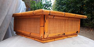 Interessante tavolino di servizio " Dal Vera" anni 70, compatto, solido e di forma quadrata, con piano/vassoio incorporato ed un'estetica che gli conferisce un design esotico o coloniale derivante dalle influenze dapprima del movimento bohémien e negli anni 70 del movimento hippie, fantastica combinazione di bambù che ne delinea il perimetro e delicato e fine intreccio di rattan o midollino lavorato ad intrecci più lunghi nel piano e tutt'intorno a piccoli intrecci, come piccole foglioline. " Dal Vera" attiva nella regione Veneto dal 1884 al 1984 negli anni 60 divenne un colosso nella produzione di arredi. In generale lo stile del tavolino è associato a designer come appunto " Dal Vera", " Vivai del Sud" o " Arpex". Il colore del tavolino ovviamente è un bel giallo dorato e l'uso a cui potrebbe essere preposto è vario: da tavolino da caffè o tè a tavolino laterale, posizionato accanto ad un divano o ad una poltrona per appoggiare bevande, libri o altri oggetti, oppure come tavolo da lettura o da snack, infine come comodino in una camera da letto o come toeletta in una postazione per la cura personale, aggiungendo uno specchio e organizzando trucchi e altri accessori. Questo permetterebbe di avere tutto il necessario a portata di mano, creando un angolo dedicato alla bellezza, solitamente in camera da letto, ma anche in bagno o in un'area guardaroba. Le condizioni del tavolino sono eccellenti, fra l'altro appena prima di scattare le foto lo stesso è stato sanificato ed oleato, pertanto è pronto all'uso. Le misure sono 90 cm * 90 cm * un'altezza di 33 cm. Poichè il lotto supera i 20 KG ricorrerò a spedizione assicurata non standard su piccolo pallet quadrato mettendo in sicurezza il tavolino per prevenire eventuali urti. E'possibile il ritiro sul posto. Per quanto riguarda la spedizione concorderò con la persona interessata il costo: infatti è ovvio che una spedizione verso la Sicilia non costa quanto una spedizione verso Milano o Torino.