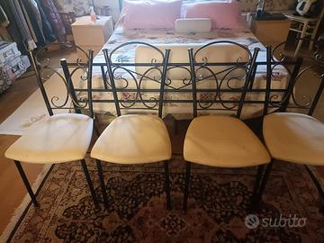 da interno, in ferro battuto e vetro temperato (per il tavolo) + ferro battuto/legno/tessuto (per le sedie). Il vetro viene appoggiato sulla base e si fissa ad essa. Per motivi di peso ed eventuale rottura il vetro non viene fotografato (è protetto da un telo rinforzato). È vetro temperato, molto pesante e resistente. RITIRO SOLO A DOMICILIO. le sedie dovranno essere ricoperte, causa effetti del tempo (nessuna rottura, solo macchiette). PREZZO LEGGERMENTE TRATTABILE