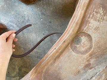 Tavolino per cerimonia del tè con scarico e tubicino in gomma per raccogliere l’acqua.