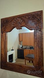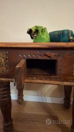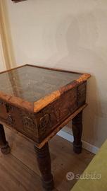 Tavolino etnico di artigianato indiano h. 60 struttura in legno masello con vetro che lascia vedere l'interno. Sportellino laterale per poter mettere oggetti all'interno con segreti laterali. Specchio coordinato 77 x 95