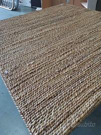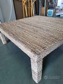 Tavolino etnico da soggiorno con trama e decorazioni in cordoncino di banano, struttura in legno. Si tratta di un articolo usato in esposizione presso il nostro showroom L'articolo è stato usato in ESPOSIZIONE all'interno del nostro showroom e potrebbe presentare qualche piccolo segno dovuto a questa. MISURE: