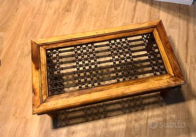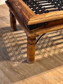 tavolino etnico stile indiano con struttura in legno e piano in ferro battuto e intrecciato. dimensioni 110 x 60 cm, altezza 41 cm.