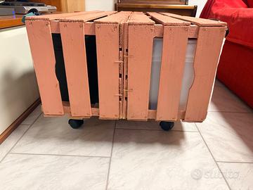 Tavolino fatto a mano con le cassette di legno della frutta, utilizzato come porta giochi, con ruote
