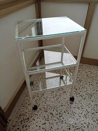 Tavolino in ferro battuto bianco con rotelle e mensole di vetro. Dimensioni H90 L50 P40